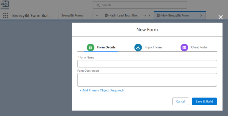 To import the JSON file, click on the New button in the BreezyBit list view in your target org and click on the New button. In the New Form pop-up, select the Import Form tab and then select the JSON file. That's it! The new form will have '(Imported)' appended to the original form name.