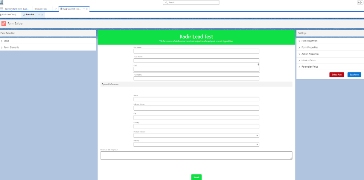 However, you can also add multiple related objects, such as Tasks, to the form. You can specify default values for the fields of those objects and when the form is submitted a related Task record is created in Salesforce.