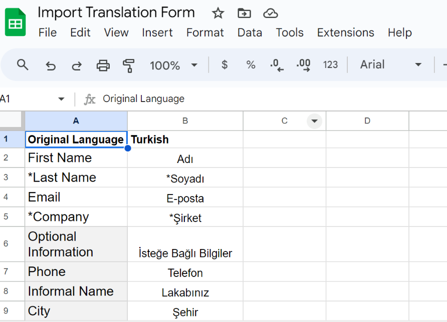 Copy paste the translations into the Translated Language column and save the file in CSV UTF-8 format. This part is VERY important! Lastly, upload the CSV file in the Form Builder, and a new form displaying the translated labels is created for you. Et voila! It's good to go!
