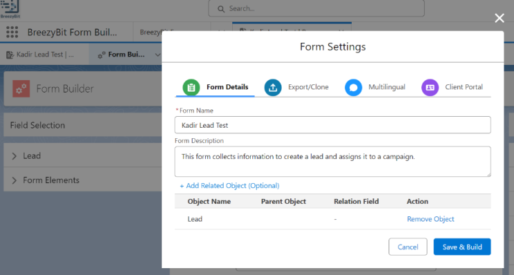 Need another Lead form, but with a few differences? Let's say you just want to tweak your base Lead form and add different fields or even a related object to it. Well you're in luck! Cloning forms is really easy. Just click on the Export/Clone tab in the Form Settings pop-up and then on the Export Form button. This will download a JSON file into the default file download folder set in Chrome. The cloned form will have '(Cloned)' appended to the original form name.